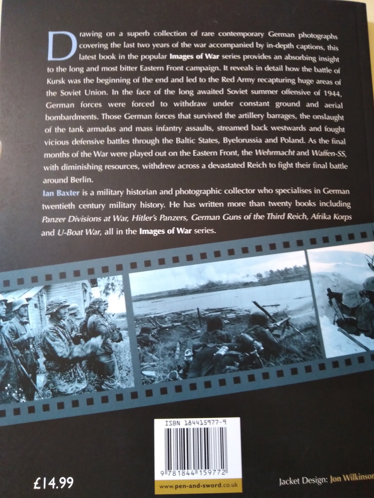 In questo bel libro della serie "Images of War" della Pen&Sword Books il tema trattato è la sconfitta delle forze tedesche sul fronte orientale. Il lasso temporale coperto da questo volume va da Kursk (estate 1943) alle ultime battaglie del 1945. Curato da Ian Baxter (un'autorità nel campo dell'iconografia dell'esercito tedesco nella seconda guerra mondiale) il libro presenta un numero impressionante di foto, per me che ho numerosi volumi dedicati all'esercito tedesco quasi tutte sconosciute o inedite. Le fonti sono molte, tra archivi di guerra, albi privati, reportage per giornali di propaganda specializzati e le foto ritraggono tutte le unità tedesche, anche se ho constatato che gran parte di queste sono Waffen SS (la cui organizzazione si ingrandì enormemente durante gli ultimi anni di guerra), tuttavia sono presenti moltissime foto dell'Heer e anche alcune delle formazioni di fanteria della Luftwaffe (una delle misure disperate dello sforzo bellico tedesco, dirottare il personale dell'aviazione a combattere come fanteria) . Il libro, diviso in 5 capitoli, più 4 brevi appendici ci porta dalla gigantesca battaglia di Kursk che fu l'ultima offensiva tedesca a est, fino alla ritirata su linee più difendibili e alla terribile offensiva Bagration da parte dei sovietici , versione sovietica dell'Offensiva Barbarossa di 3 anni prima e che portò in pochissimo tempo uno sfinito esercito tedesco fino ai vecchi confini del Reich. Interessanti sono le foto che ritraggono i soldati tedeschi sulla neve, forse ormai abituati al clima dopo l'ecatombe del 1941 alle porte di Mosca, ma allo stesso tempo molto evocative.Non solo i soldati sono il soggetto di questo bel libro ma anche gli armamenti, molte infatti sono le foto di cannoni, semoventi e anche qualche carro armato. Le didascalie sono molto informative e descrivono al meglio ciò che possiamo vedere nelle foto. Ogni capitolo è preceduto da un esaustivo resoconto delle battaglie e della situazione bellica del momento descritto, Baxter sa di cosa parla e il libro è utile anche per conoscere e andare a ritrovare velocemente eventi salienti degli scontri sul fronte orientale.
